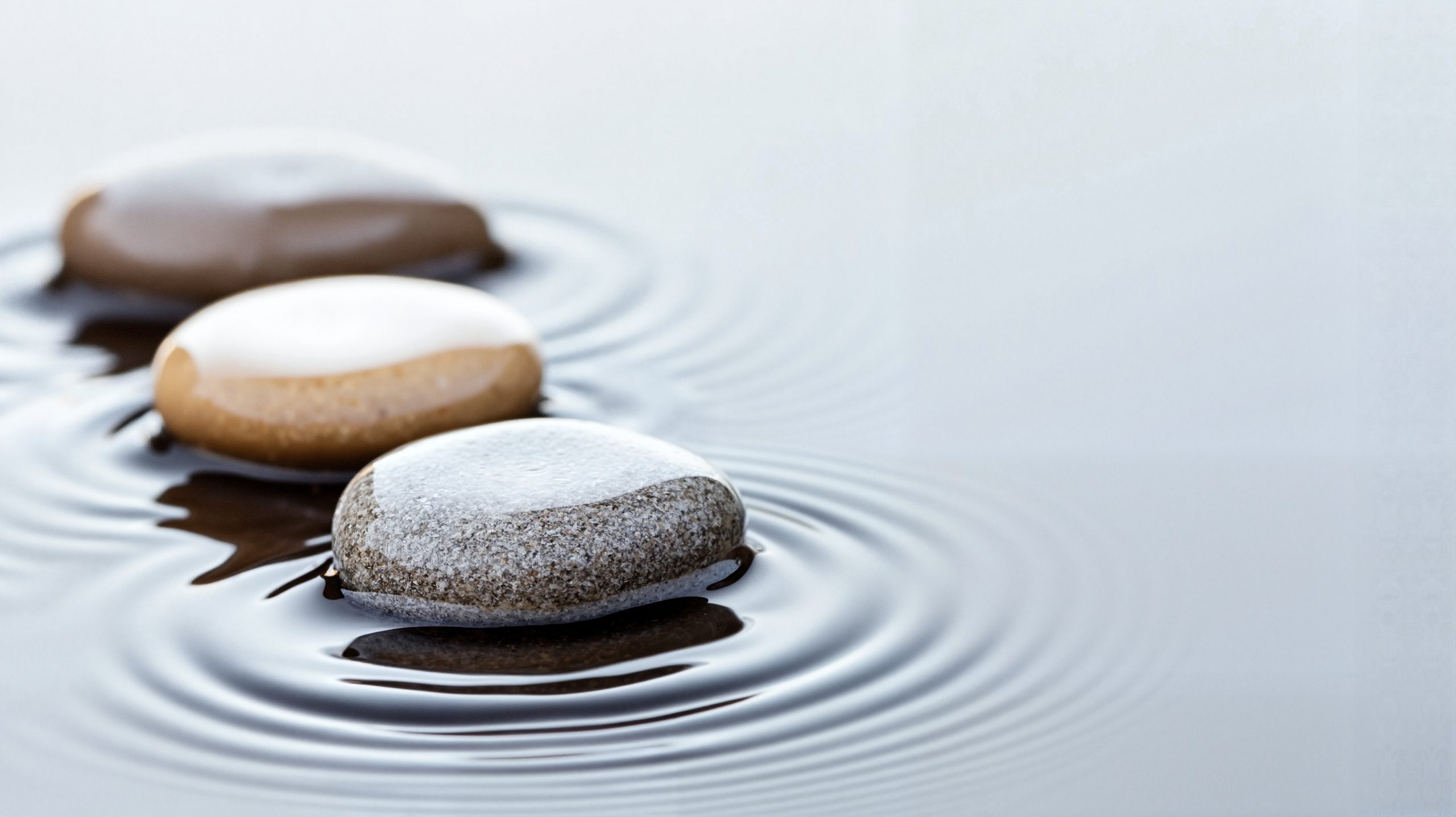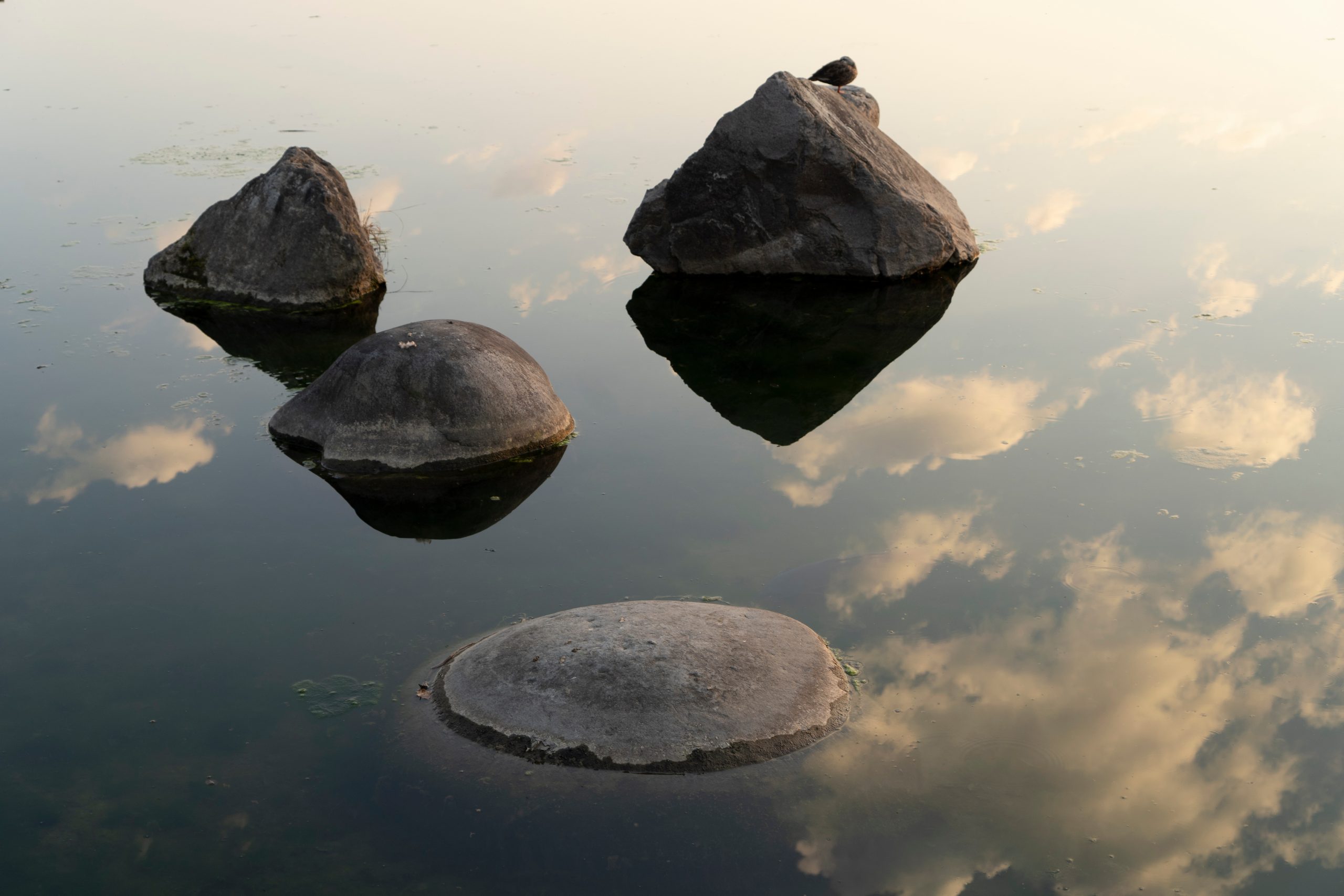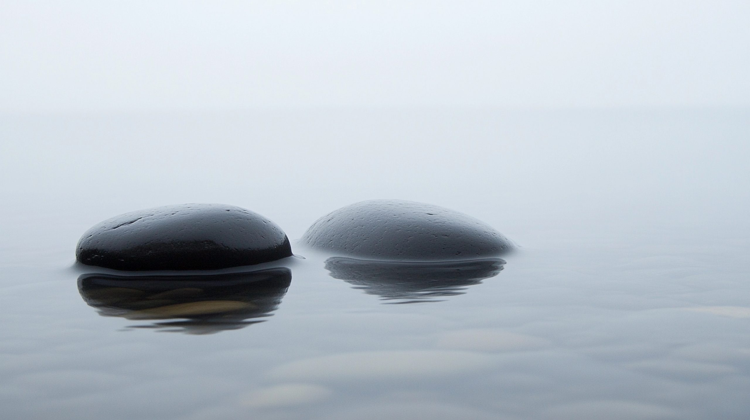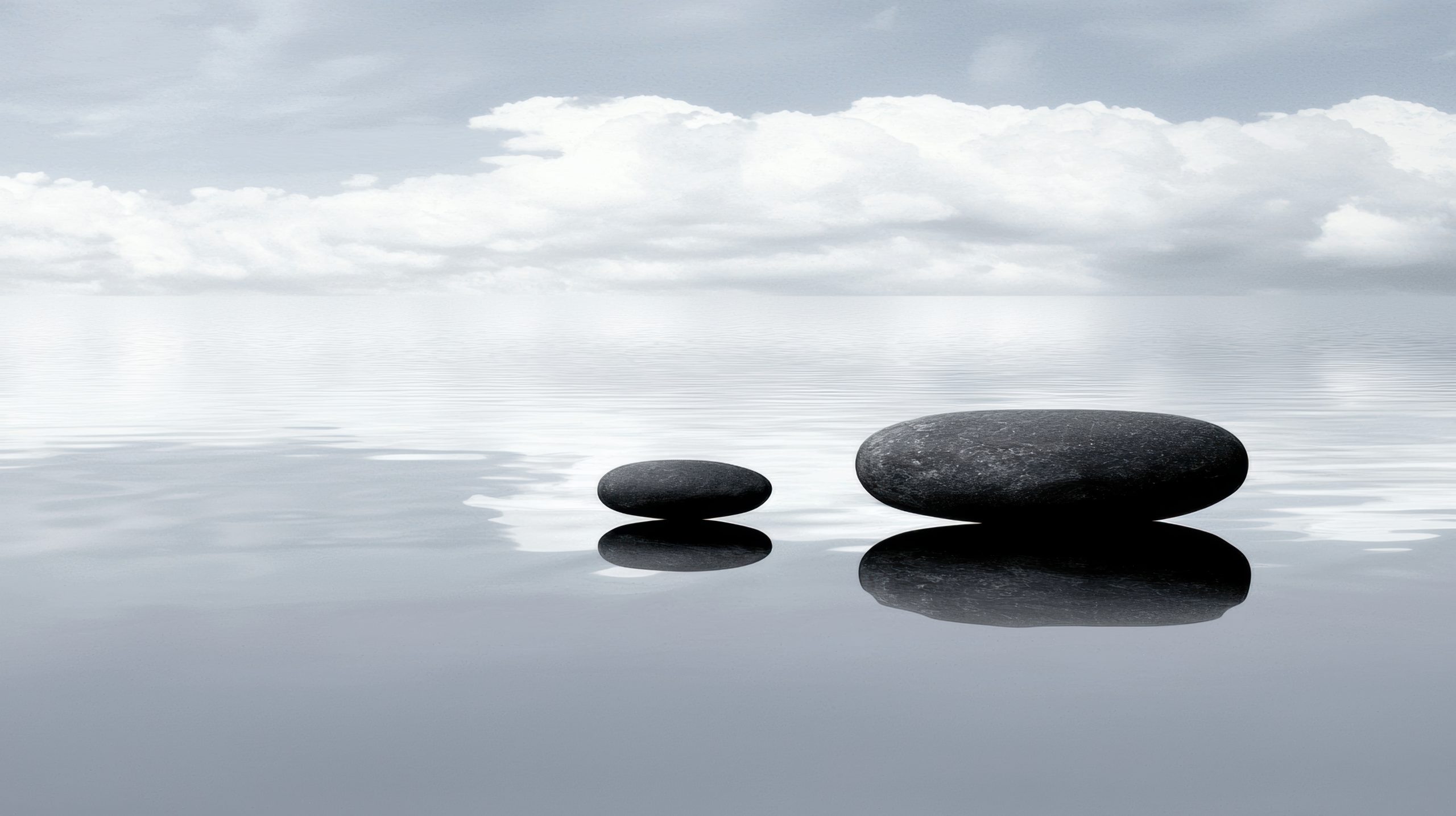 The image depicts a serene scene of two large, dark gray boulders floating on a calm body of water. The water’s surface is perfectly still, reflecting the sky and clouds above. The sky is a light gray color, with fluffy white clouds scattered across it. The overall color palette of the image is monochromatic, with shades of gray dominating the scene. The perspective of the image is from a low angle, looking up at the boulders and the sky, creating a sense of grandeur and scale.