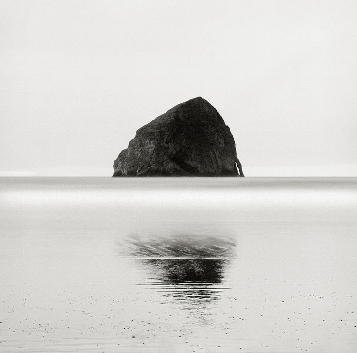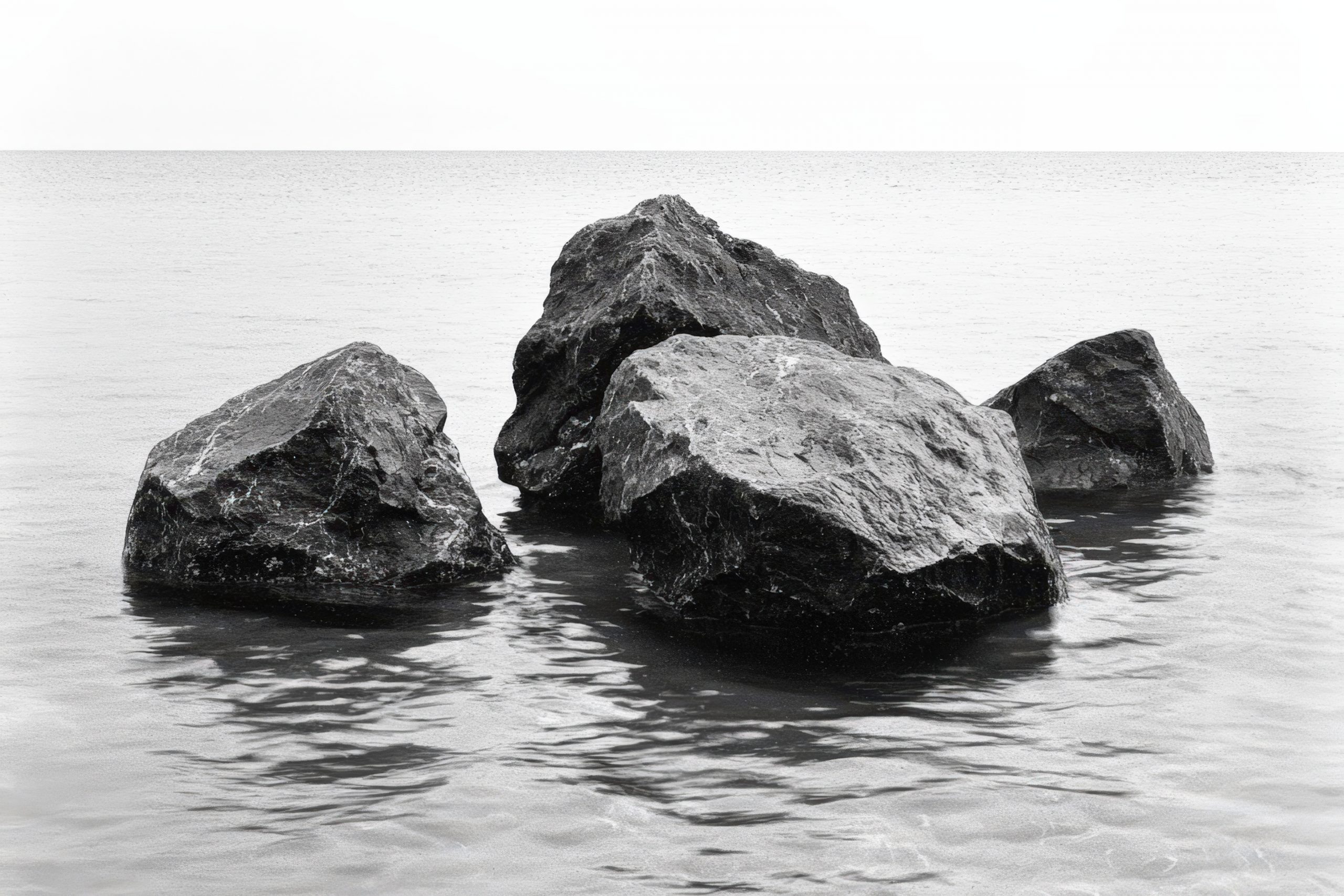 This serene black and white photograph captures calm ocean rocks amidst tranquil waters, showcasing nature’s beauty and minimalism in stunning monochrome tones.
