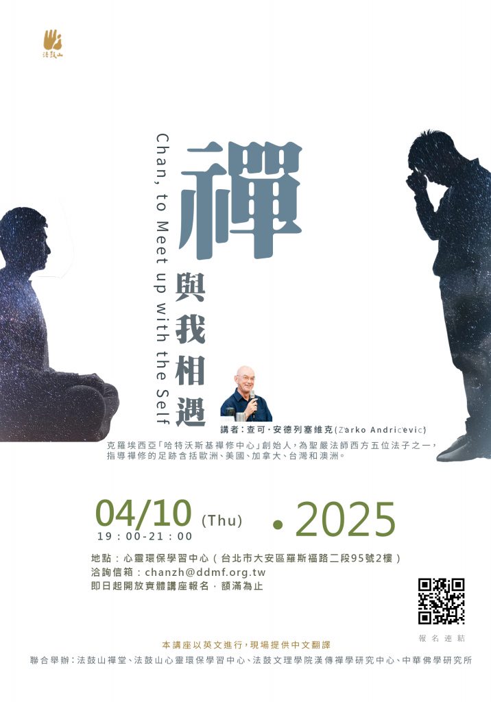 聖嚴法師西方法子查可.安德列塞維克(Žarko Andričević),同時也是克羅埃西亞「哈特沃斯基禪修中心」創辦人,指導禪修足跡遍佈歐、美、加、澳和台灣,分享個人禪修體驗與佛法「不二」的觀念,強調放下對立、回到當下的實踐力量。